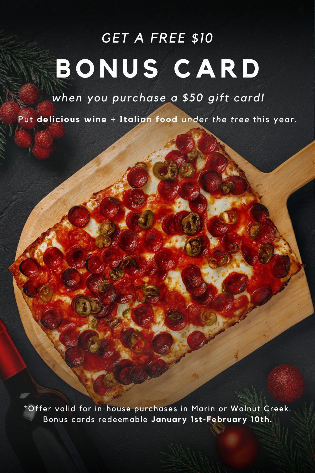 *Valid for any gift cards purchased in-house at Pizzalina Walnut Creek from Dec 15th to Dec 31st.